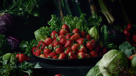 A stunning display of fresh strawberries surrounded by an array of vibrant green vegetables. Perfect for showcasing healthy eating and culinary creativity.