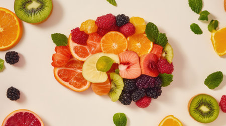 This vibrant image showcases a colorful arrangement of fresh fruits such as oranges, kiwis, and berries. Mint leaves add freshness to the aesthetic, ideal for health-oriented projects.