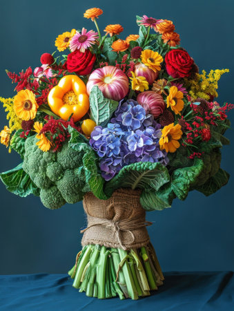 An AI generated illustration of a bouquet full of different types of fruits and vegetables