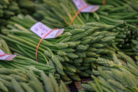 Fresh local foraged wild green asparagus for sale at a farmers market on Place Broglie Square in the historic center of Strasbourg, Alsace, France