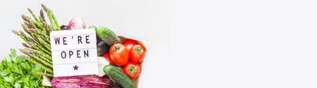 End of quarantine. Fresh organic vegetables in eco friendly wooden box with text We're Open lightbox flat lay, top view on gray background. Sustainable lifestyle. Zero waste, plastic free concept