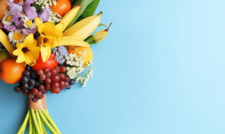 Vibrant bouquet of fresh fruits and delicate flowers against a tranquil blue background. AI Generative