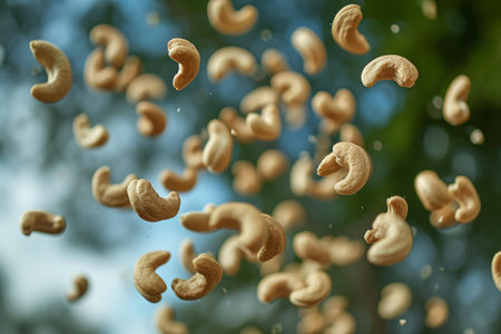 Capture of airborne cashew nuts floating with a beautiful bokeh effect in the backdrop