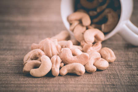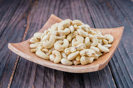 Cashew nuts in a small plate on a vintage wooden table as a background. Cashew nut is a healthy vegetarian protein nutritious food