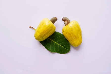Cashew apple and cashew seeds arranged on a green textured base with grey background ,selective focus