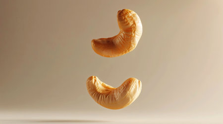 Two cashew nuts are suspended in mid-air against a soft gradient backdrop, highlighting their smooth texture and appealing form, perfect for food-related themes, AI generated