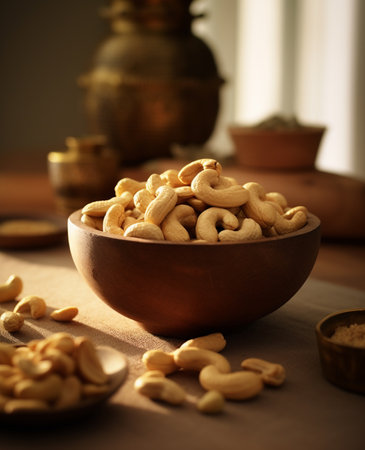 A wooden bowl filled with fresh cashew nuts on a rustic table with scattered nuts around, creating a natural and wholesome look. Perfect for food, health, and organic themes.