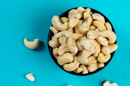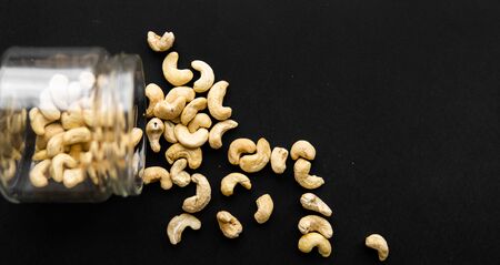 Cashew nuts scattered on the black table from a jar. Cashew nut is a healthy vegetarian protein nutritious food.