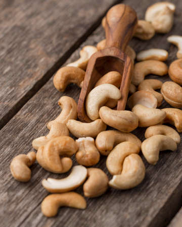 Dry cashew nuts in wood olive bowl on concrete background closeup, shallow focus