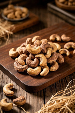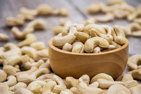 raw cashew nuts in wooden bowl on rustic table, healthy vegetarian snack