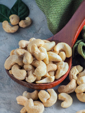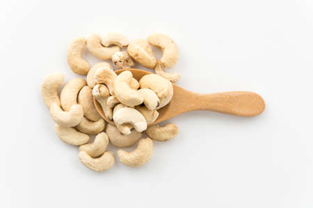 Spoon is filled with shelled cashew nuts. Advertising photography for marketplaces. Top view. Healthy nuts.