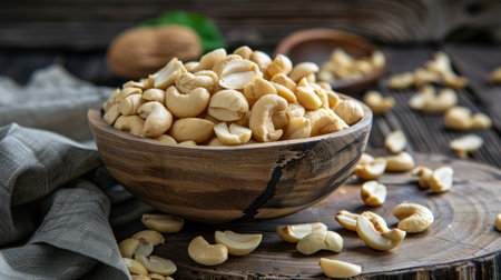 A stunning image of flying cashew nuts above a rustic wooden bowl, showcasing their natural texture and inviting colors. Perfect for food-related themes.