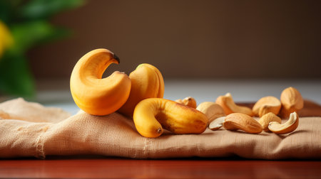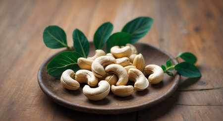 AI Generated. Fresh cashew nuts arranged on wooden plate with green leaves