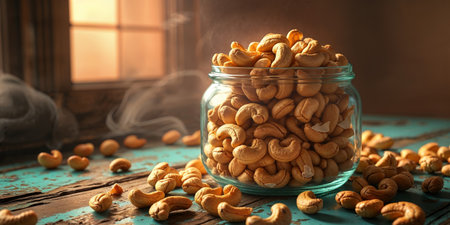 AI Generated. Delicious Roasted Cashews in Glass Jar on Wooden Table