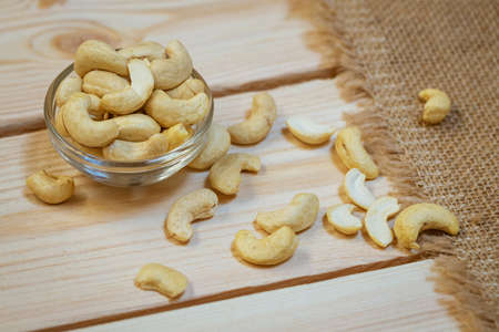 Raw cashew nuts lie in a glass bowl and scattered on a wooden background and burlap. Close up.