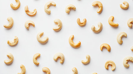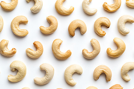 A vibrant collection of cashew nuts displayed in an artistic layout, showcasing their unique shape and smooth texture against a clean white background. Ideal for food-related projects.
