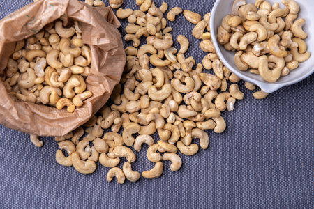 Paper bag and bowl filled with roasted cashew nuts placed on a textured gray surface, with a few nuts scattered around for a natural, appetizing look.