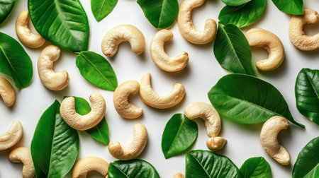 A fresh arrangement of raw cashew nuts and vibrant green leaves on a white background, showcasing a healthy and nutritious snack for various culinary uses.