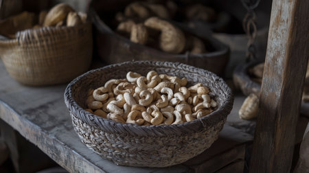 A captivating scene featuring freshly harvested cashews in a woven basket, showcasing rustic charm and organic appeal, perfect for food enthusiasts and culinary inspiration.