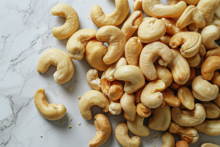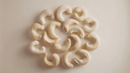 A beautiful overhead shot of fresh cashew nuts arranged on a light surface, perfect for showcasing healthy snacks and culinary creativity.