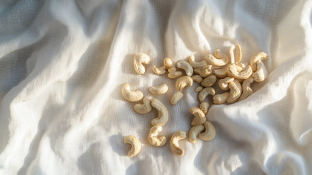Cluster of raw cashew nuts scattered on textured fabric, illuminated by natural light. Perfect for healthy snack concepts, culinary creations, or wholesome diet themes.