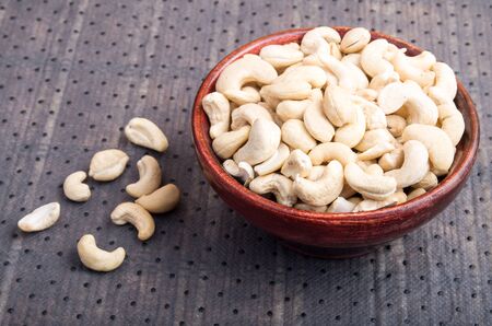Selective focus on at the tasty and healthy raw cashew nuts in a brown bowl on fabric background