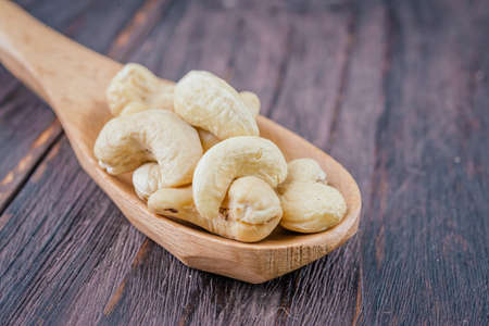 Peeled cashew nuts lie in wooden spoon. Top view of nuts close-up. Advertising photography for marketplaces or online stores.