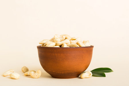 Full Raw Cashew Nuts in white ceramic bowl on wood table
