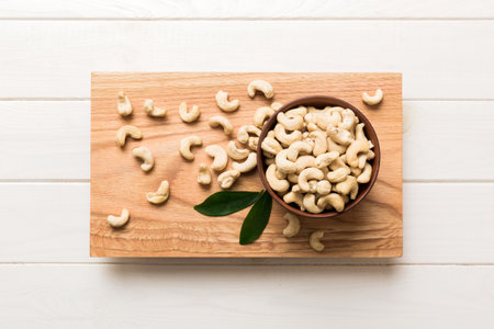 Tasty cashew nuts in a bowl on wooden table, top view.Bowl with cashew nuts on a wooden table, flat lay.