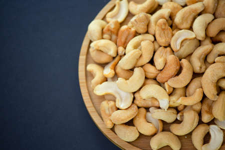 Cashews Nut or cashewkerne nuts group Protein and healthy food for diet in a wooden plate on a black background.