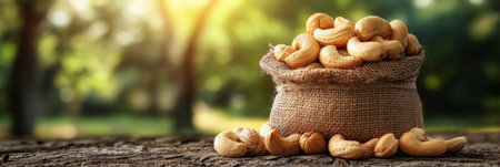 Overflowing Burlap Sack of Cashew Nuts on a Sunny, Rustic Background with Ample Copy Space