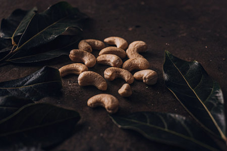 A collection of cashew nuts sitting on top of fresh green leaves, creating a natural and organic composition. The nuts are scattered haphazardly, adding visual interest to the scene.