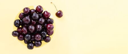 Fresh cherry berries in old white plate on yellow background