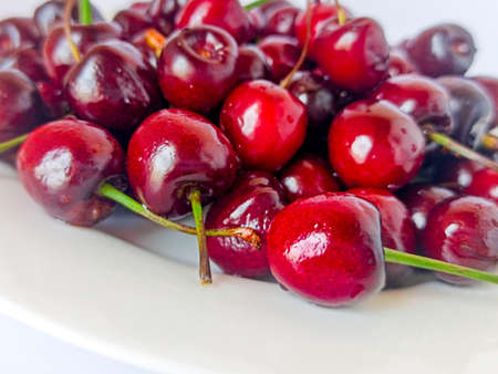 Cherries on a white background. Berries on a white plate. Selective focus