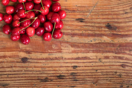 Fresh cherries on the old wooden table, top view