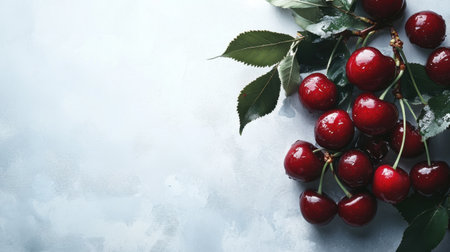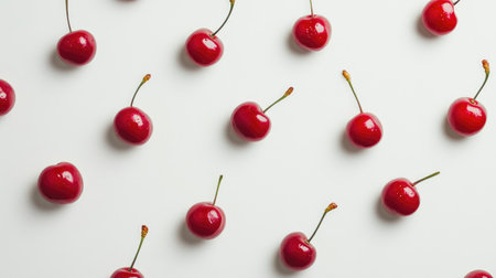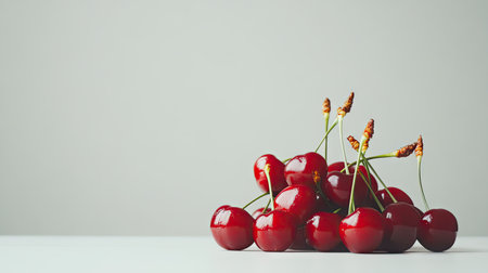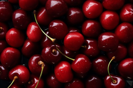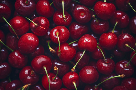 A stunning display of fresh cherries showcasing their rich red color and glossy surface. Ideal for food photography, recipes, or culinary inspirations.