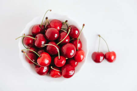 Fresh juicy red cherries in a white plate on the white wooden background. Top view. Copy, empty space for text.