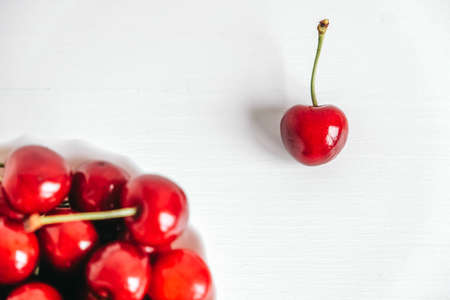 Ripe cherries, top view. On a wooden substrate on a white background. Summer berry. The concept of healthy eating.