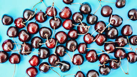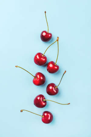 Red ripe cherry beries on blue background. Cherry pattern. Flat lay. Healthy food concept.