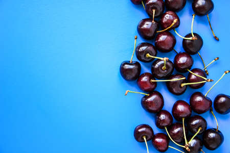 Composition of ripe cherries on a blue background. Flat lay, top view.