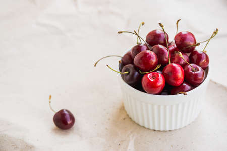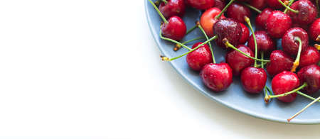 Ripe cherries on a white plate on a white table. summer background.