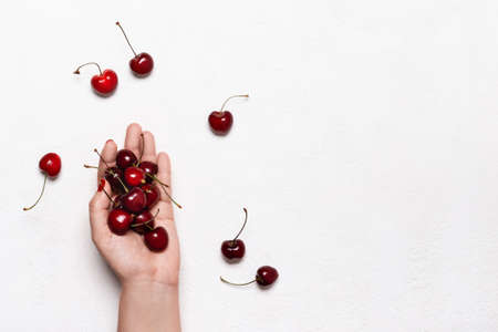 Female hand holds ripe cherries on white table. Summer background.