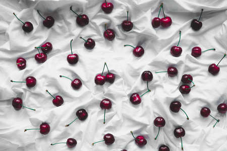 Top view of a cherry on a crumpled white background of bed linen.