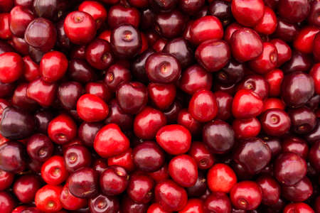 Ripe cherry texture background. Summer june fruit harvest. Free copy space, top view flat lay.