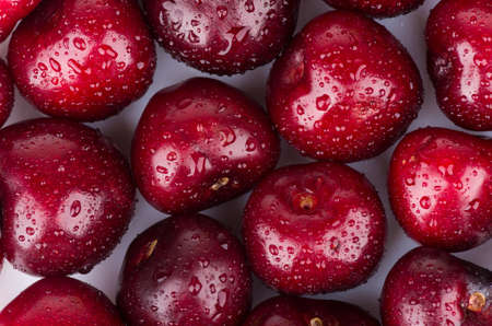 Ripe sweet cherries with water drops closeup