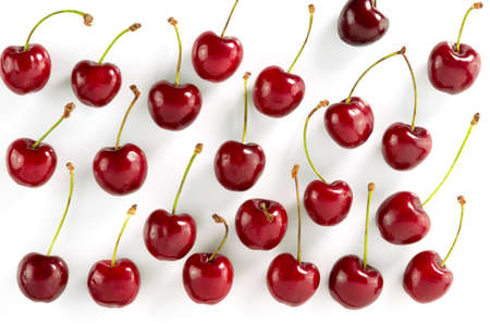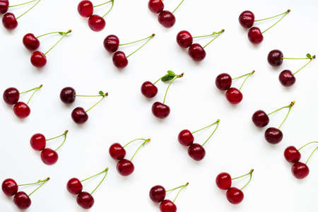 Cherries with petioles lined in rows on a white background. Pattern of cherries. Fruit Pattern