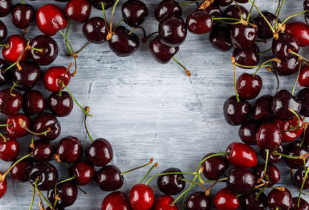Frame of ripe cherries on a blue background. Copy space for text. Summertime fruits. Summer berries of ripe juicy cherry