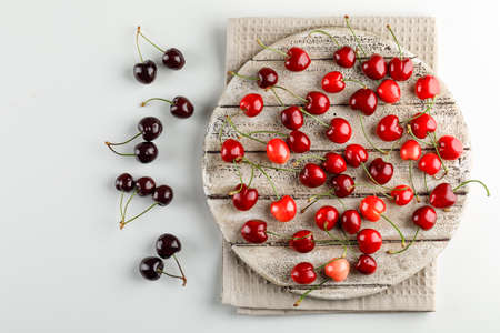 Cherries on a wooden board on white and kitchen towel background. flat lay.