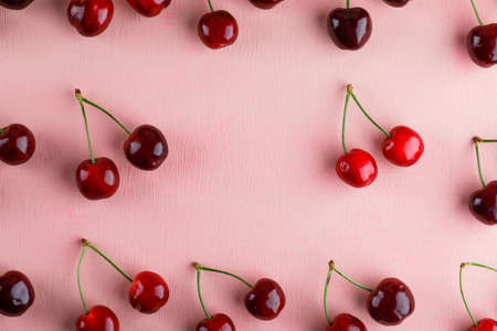 Red cherries abundance on pastel pink background with flat lay composition, top view, fruit harvest concept