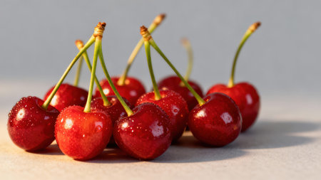 Close-up of a cluster of ripe cherries hanging from a branch, glistening with morning dew, ready for picking.